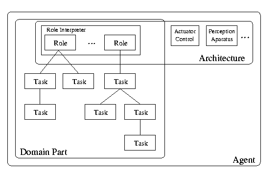 Thus, an "agent" is an abstract concept that is filled with a particular content by defining the possible roles of the agent and by providing a runtime environment that is capable of executing the given role models. The concept of an agent thus encloses the architecture that contains the perception and actuation subsystem as well as the role interpreter. which links the domain-independent architecture to the domain specific aspects of the different roles by associating each role with particular tasks.